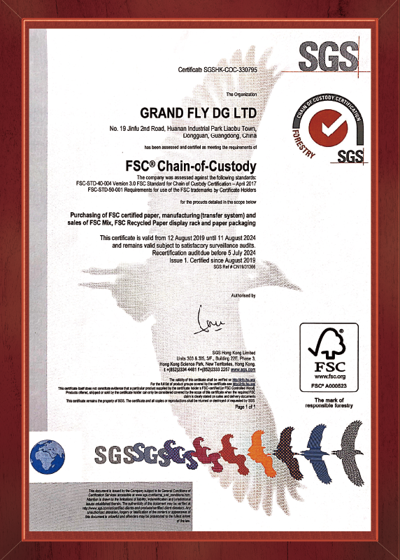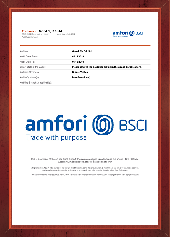 Grand Fly has passed the ISO 9001 quality system certification, FSC certification, GMI printing system certification, as well as Sedex 4P, BSCI, LOWE’S, SAM’S Club, TESCO, Target, Walgreens, Wal-Mart, Carrefour, Disney, K-mart, Coles,Woolworths and other audits